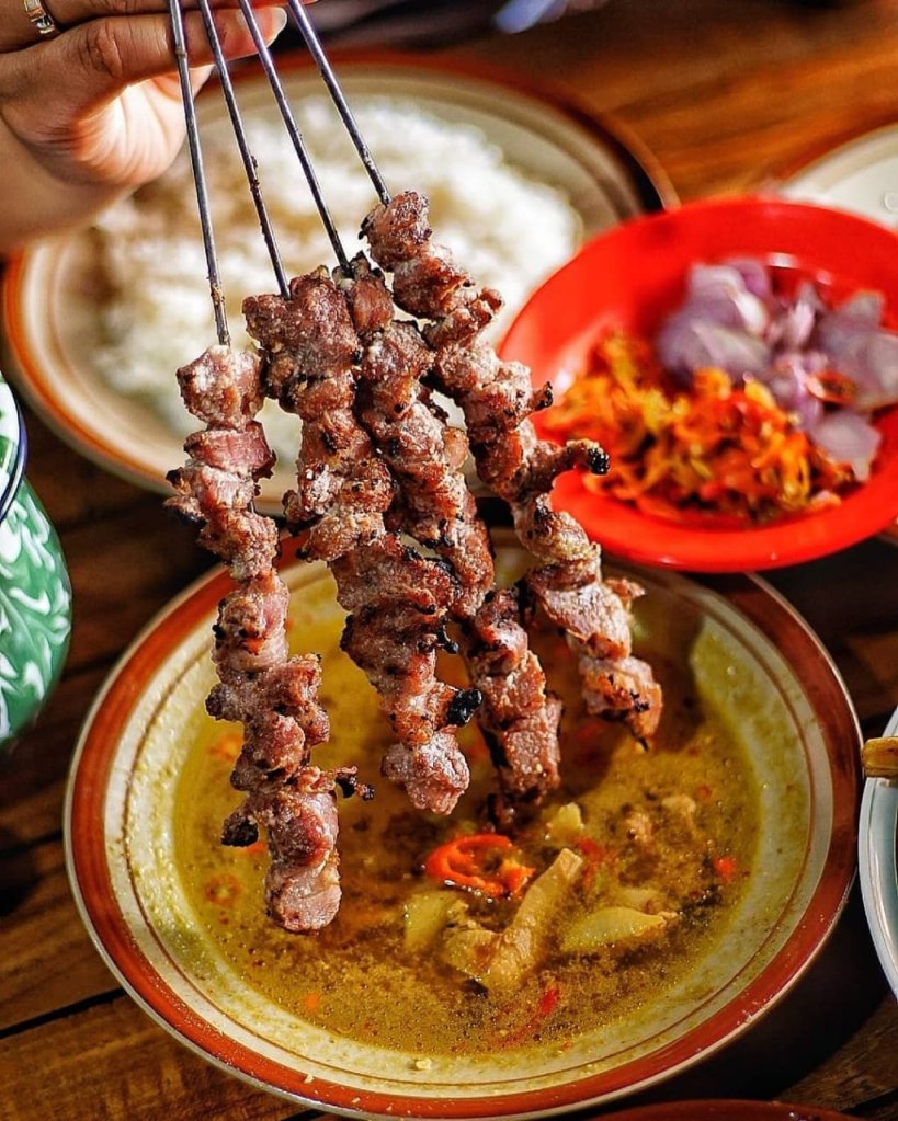 Sate merupakan jenis makanan olahan daging yang menjadi legendaris di tanah air. Namun, sate juga banyak bermacam-macamnya sesuai dengan daerah tertentu. Nah sate yang terkenal di Jogja ini adalah sate klatak. Bedanya dengan sate yang lain yaitu sate klatak ini tidak menggunakan bambu untuk menusuk dagingnya, melainkan menggunakan besj jeruji sepeda. Proses pembakarannya pun hanya dibumbui dengan garam dan merica. Kamu bisa menyajikan sate klatak ini bersama dengan kuah gulai.